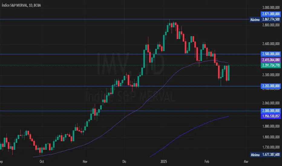El índice del Merval de Argentina viene cayendo desde máximos históricos en los 2.871.000 puntos hasta llegar a un mínimo en los 2.203.000 puntos, rompiendo por debajo de la media